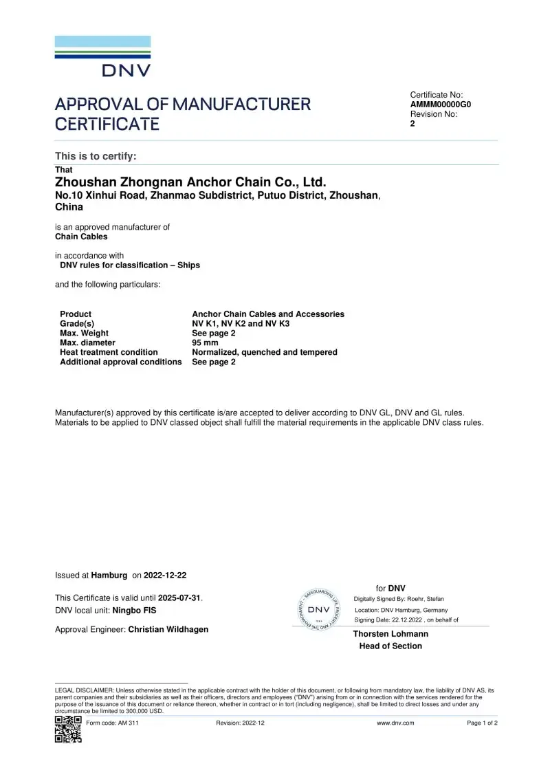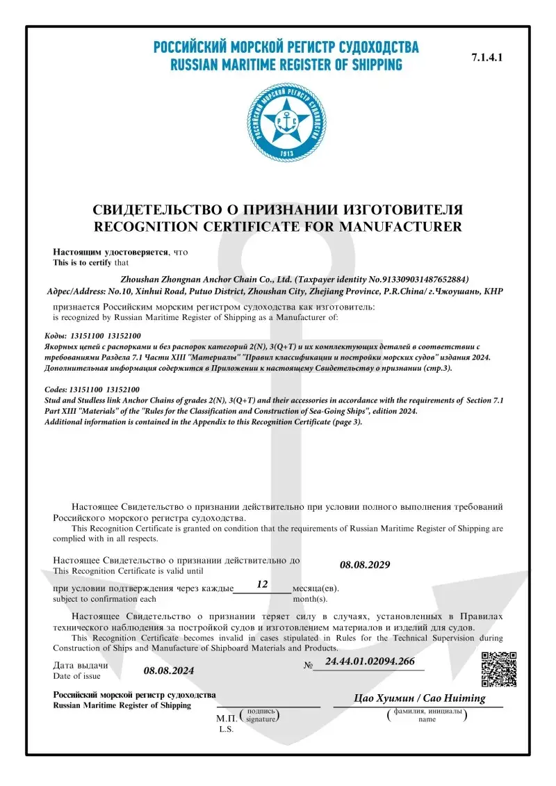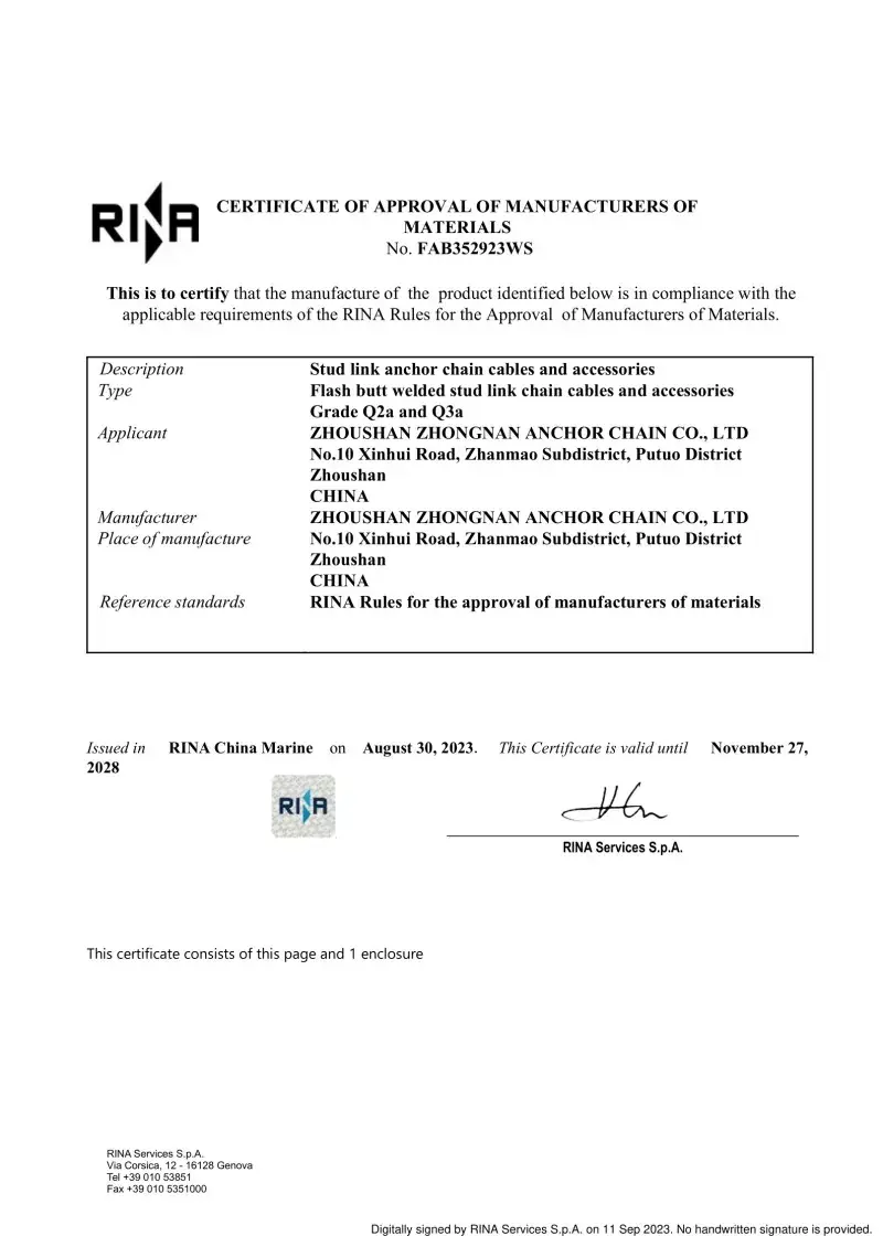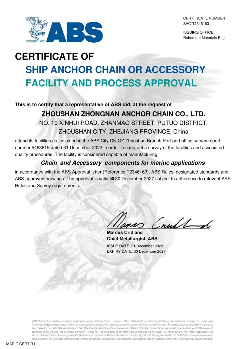 Да. Секој ланец произведен во нашата фабрика доаѓа со сертификација од водечките меѓународни друштва за класификација, како што се CCS, ABS, DNV, BV, LR, NK, RINA, KR и RS. Овие сертификати потврдуваат придржување на ланецот кон IACS и ISO стандардите и неговите докази за оптоварување и спецификациите на оптоварувањето.