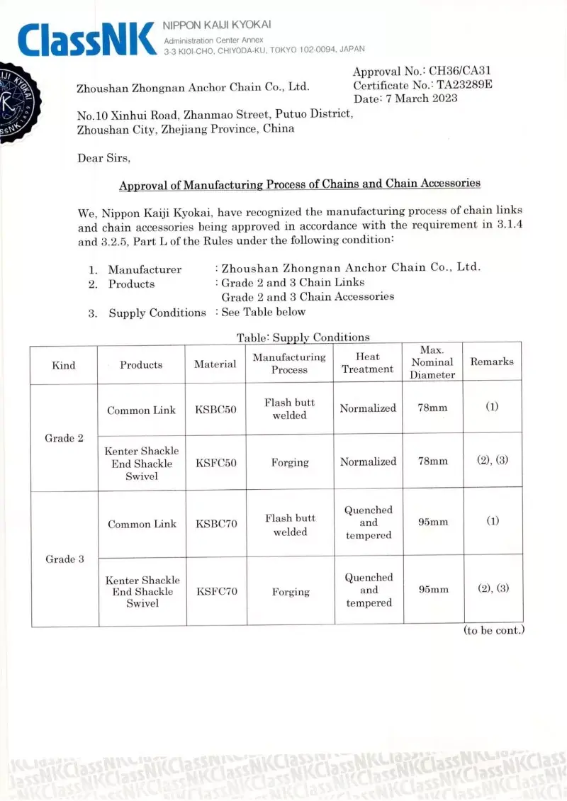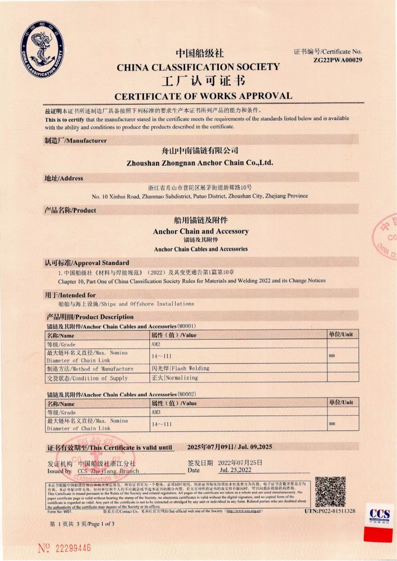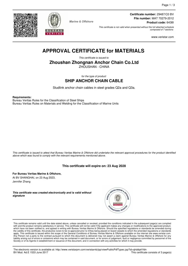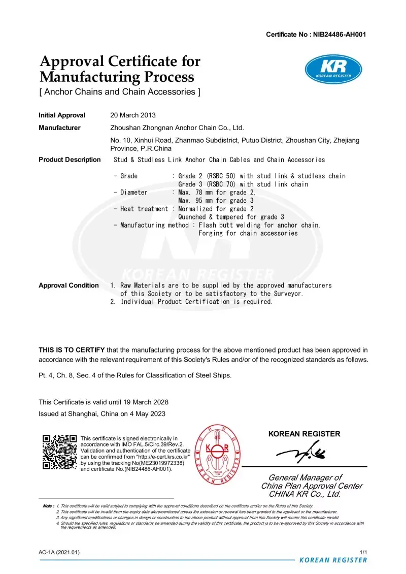 Да. Секој ланец произведен во нашата фабрика доаѓа со сертификација од водечките меѓународни друштва за класификација, како што се CCS, ABS, DNV, BV, LR, NK, RINA, KR и RS. Овие сертификати потврдуваат придржување на ланецот кон IACS и ISO стандардите и неговите докази за оптоварување и спецификациите на оптоварувањето.